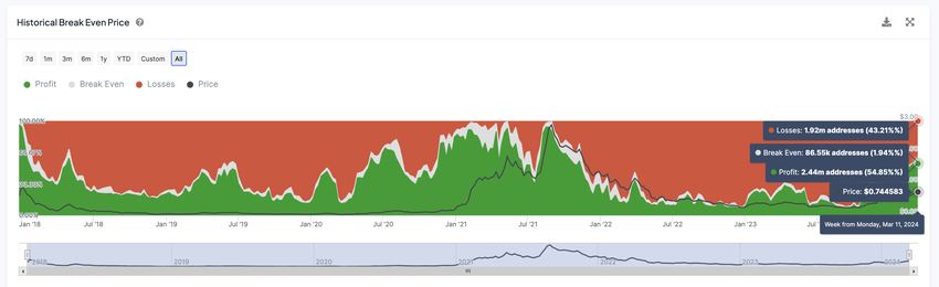 現在、ADA保有者の過半数、54.85%は黒字であり、利益を享受している。これとは対照的に、43.21%は損失を抱えており、1.94%の僅差で損益分岐点ギリギリに位置している。