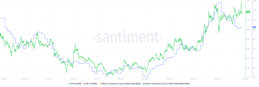 しかし、この確立されたパターンは最近驚くべき展開を見せた。ここ数日、ADAの価格が上昇するにつれて、クジラの取引量が変化したのだ。1,192件の取引があった3月6日から、3月14日には953件まで減少した。わずか1週間で20%も減少したことになる。