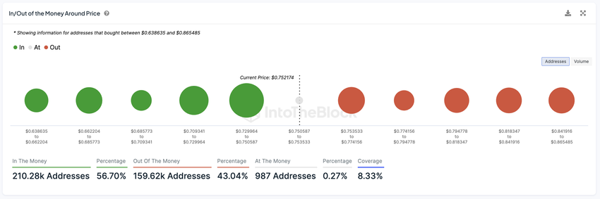 ADAのイン/アウト・オブ・ザ・マネー・アラウンド価格チャートを分析すると、0.72ドル付近に強力なサポートがあり、次いで0.70ドルにもサポートがあることがわかる。ADAがこれらのサポートゾーンに抵抗できない場合、0.63ドルまで下がり続ける可能性がある。