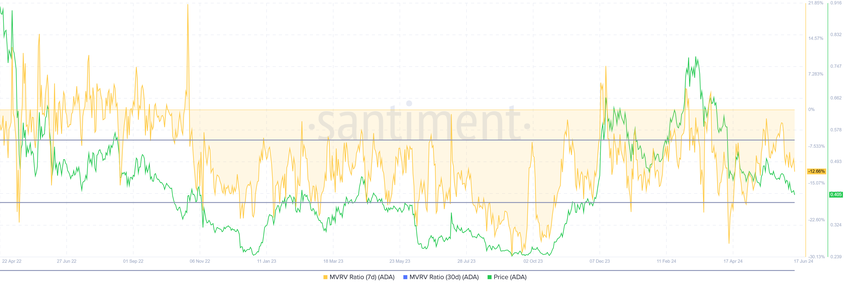 MVRV比率は投資家の利益と損失を評価する。現在、カルダノの7日MVRVは-12%で、損失を示しており、買い圧力が急上昇する可能性がある。歴史的に、-6%から-18%の間のADA MVRVは通常、上昇の開始を示し、蓄積の機会ゾーンを示す。