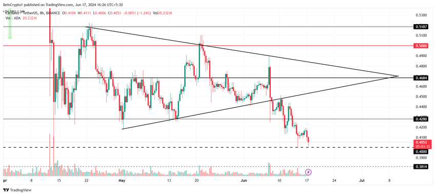 カルダノの価格は最近、左右対称の三角形パターンから抜け出せず、大きな後退に直面した。それどころか、0.40ドルまで下落し、暗号通貨が弱気に転じたことを示している。