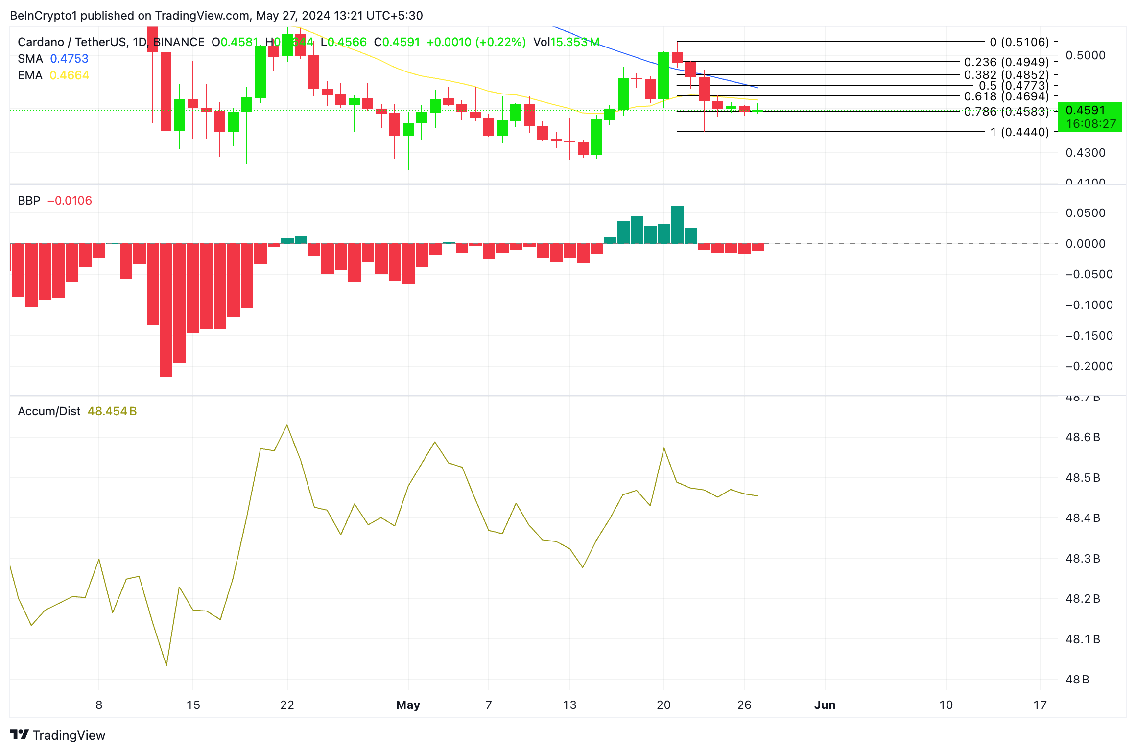 5月21日に0.51ドルでピークをつけて以来、ADAの価格は下落傾向にある。この記事を書いている現在、0.45ドルで取引されており、その価値はその後11%下落している。