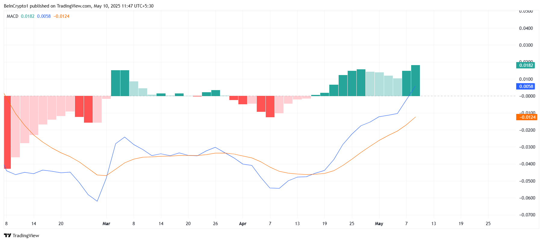 上昇傾向の技術指標がカルダノのマクロ勢いを支持している。移動平均収束拡散(MACD)は、上昇の勢いが強まっていることを示している。