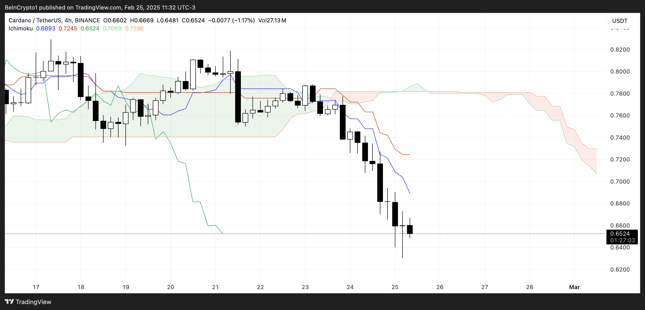 ADAの一目均衡表は強い弱気トレンドを示している。価格は雲のはるか下で取引されており、下落の勢いが続いている。先行スパンA(緑の線)が先行スパンB(赤の線)より下にあるため、先行する赤い雲は弱気の感情を反映している。