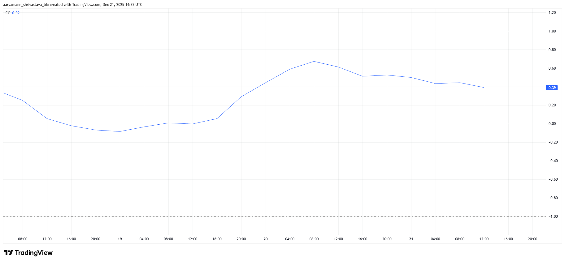 マクロ環境もNIGHTの堅調さを後押しする。トークンはビットコインとの相関が弱く、市場全体の不透明感から守られている。この独立性により、ビットコインが勢いを取り戻せない中でもNIGHTは上昇傾向を維持してきた。