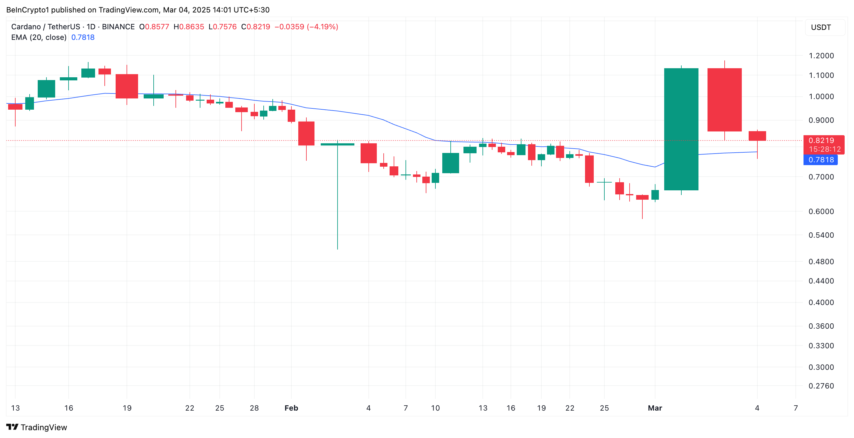 Sponsoredさらに、ADAの価格は現在、20日間の指数移動平均線(EMA)を下回る準備をしている。この重要な移動平均線は、過去20取引日の資産の平均価格を測定し、最近の価格変動により重みを置いている。