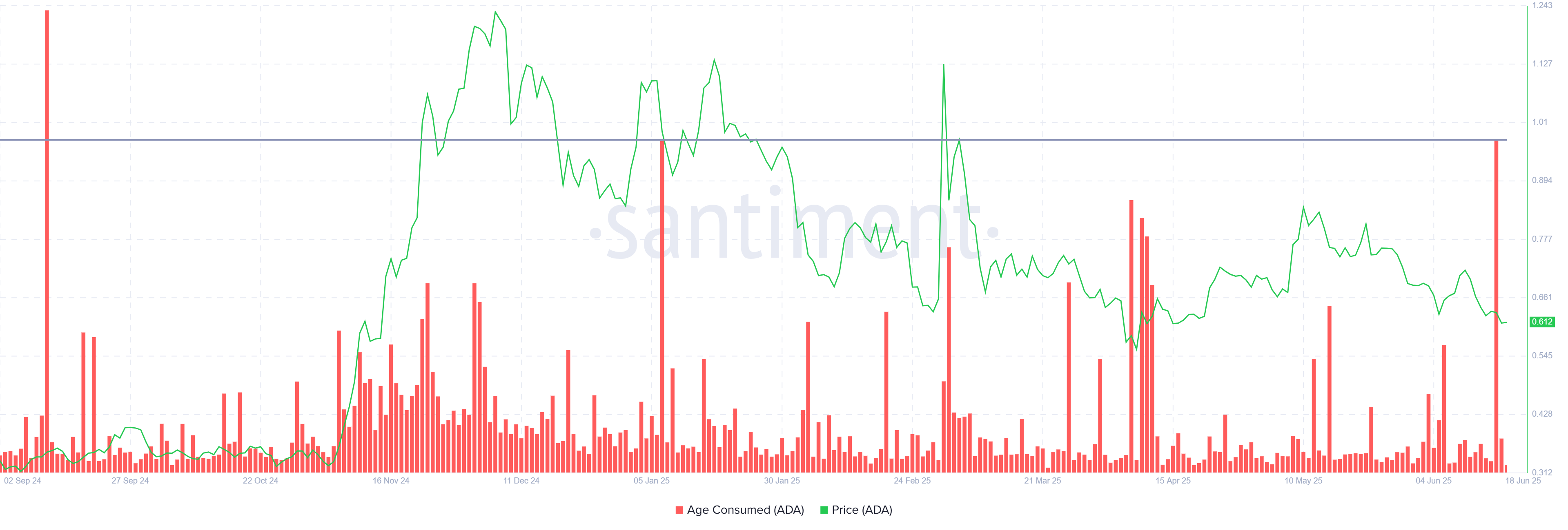 最近の「消費された年齢」指標の急上昇は、カルダノの長期保有者が積極的に保有を売却していることを示している。この9か月で最大の急上昇は、投資家の信頼が低下していることを示唆している。「消費された年齢」指標は、長期間取引されていないコインの動きを追跡する。