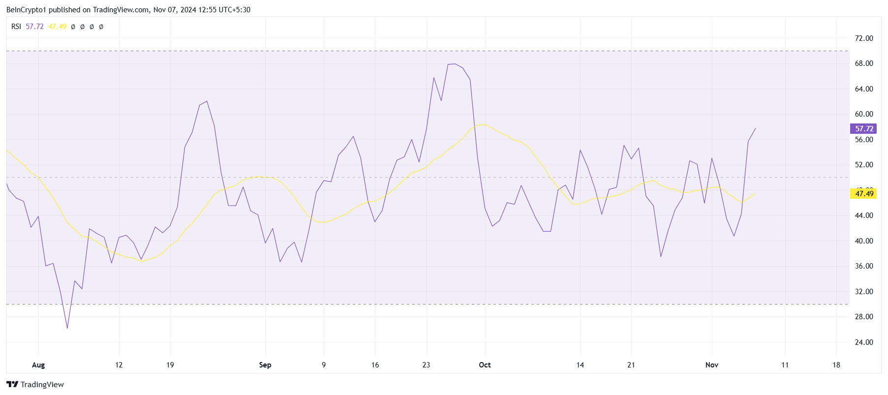カルダノの広範なマクロ動向は不確かであり、相対強度指数(RSI)などの技術指標が混在する信号を示しています。RSIは中立線の50.0を超えて位置していますが、まだそれを確固たるサポートに変えていません。このレベルは通常、持続的な強気の動きを示す重要なレベルです。