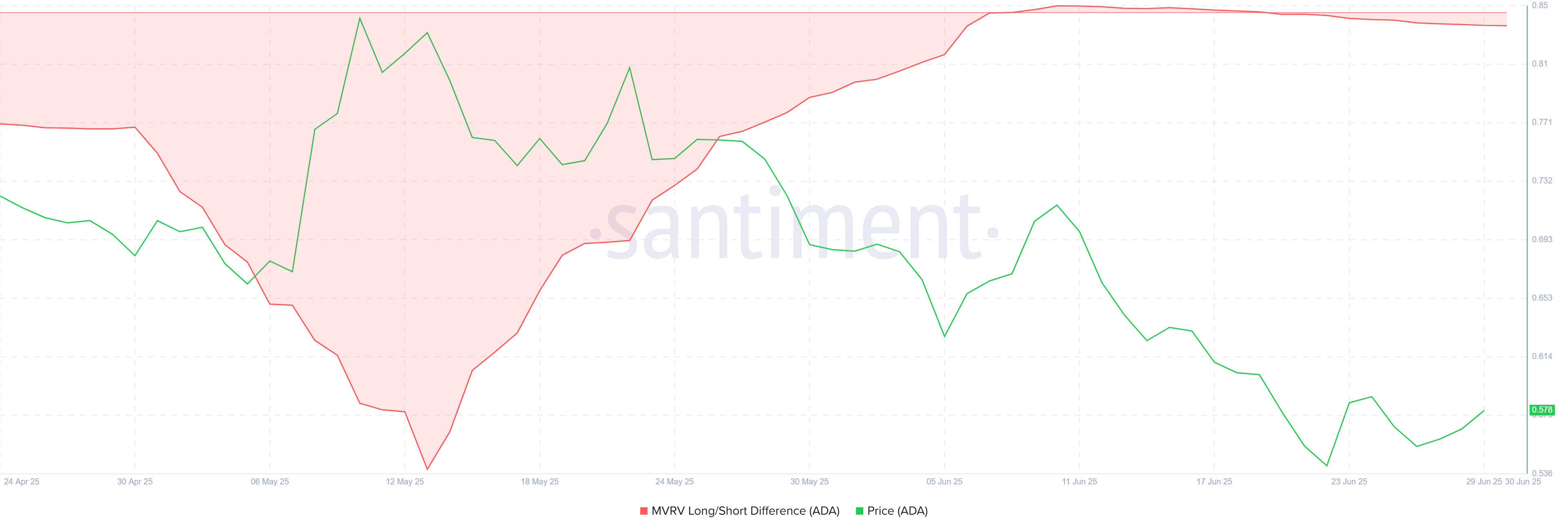 本稿執筆時点で、カルダノの価格は12%上昇し、0.60ドルで取引されている。しかし、この水準はカルダノがサポートとして確立する必要がある重要な障壁を示している。市場のセンチメントと蓄積の傾向はポジティブな背景を提供しているが、アルトコインはこのレベルで重要な試練に直面している。