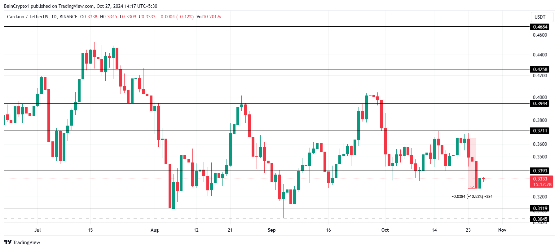 カルダノの価格は最近の日々で10%下落し、現在は0.33ドル以下で推移している。この価格帯は1か月以上にわたって重要なサポートフロアとして機能しており、それを失うとさらなる下落が示唆される。