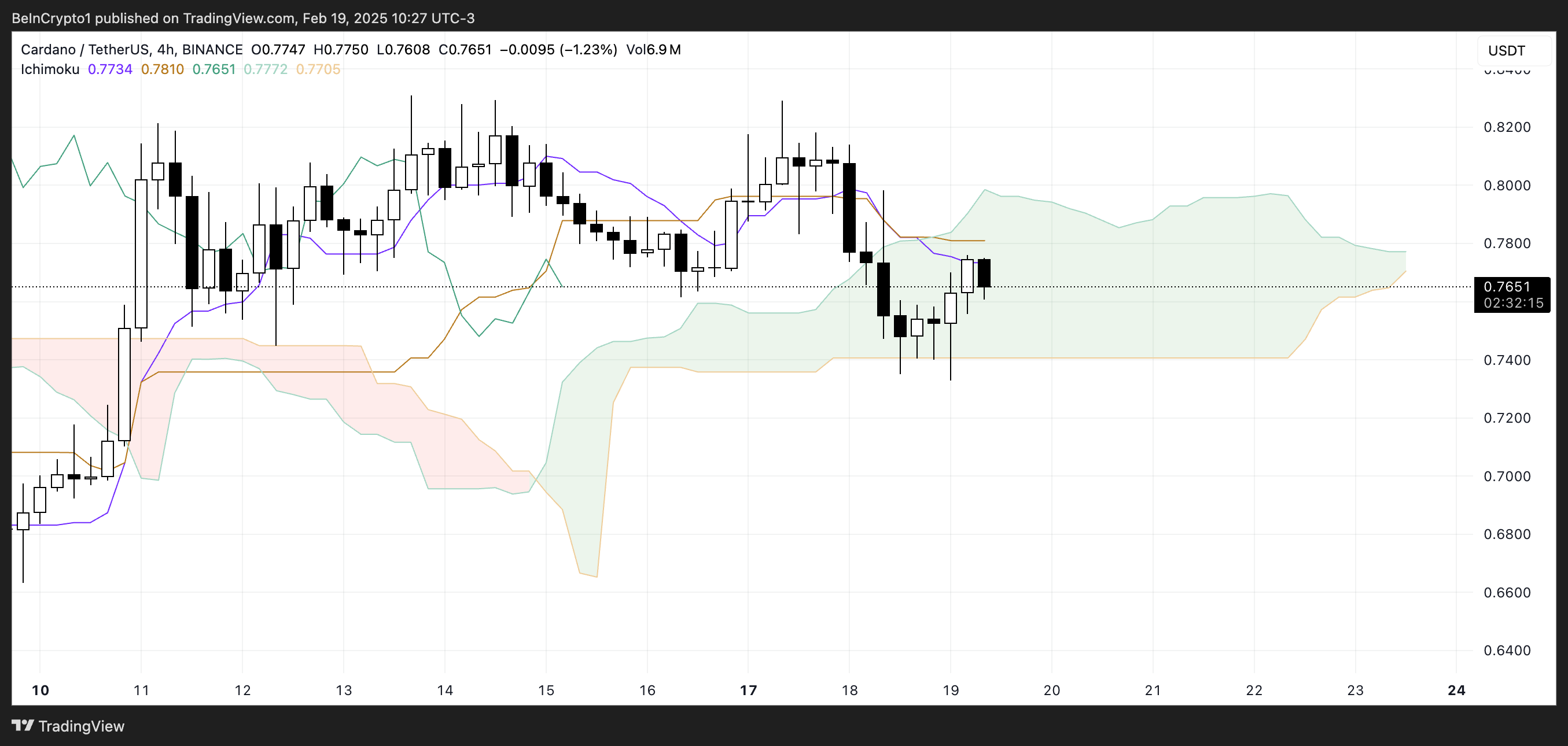 カルダノの一目均衡表チャートは現在、混合したセットアップを示している。価格は緑の雲の中で取引されており、不確定な状態を示している。