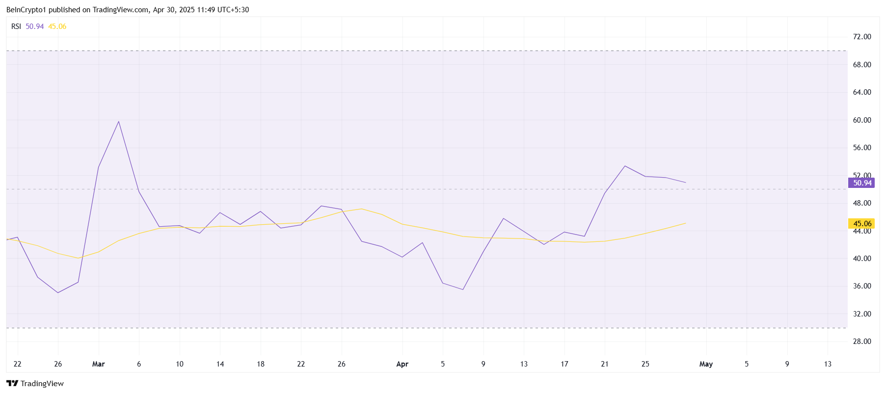 カルダノの全体的な勢いは改善の兆しを見せており、特に相対力指数(RSI)などの技術指標がある。現在、RSIは2か月近くの高値にあり、50.0の中立マークを上回るポジティブゾーンに位置している。これは、クジラによるADAの蓄積と広範な市場環境によって駆動される上昇傾向を示している。