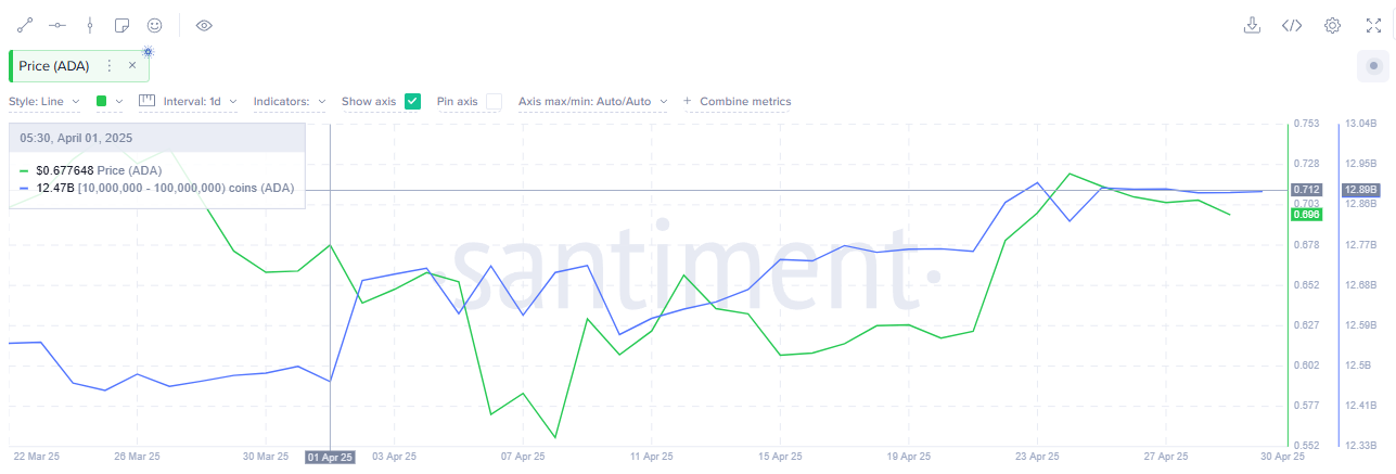 4月にはクジラの活動が活発で、1000万から1億ADAを保有するアドレスが4億2000万ADA以上を購入し、約2億8900万ドル相当で、保有量を124億7000万ADAから128億9000万ADAに増やした。このカルダノの最大保有者による一貫した蓄積は、信頼の重要な指標である。