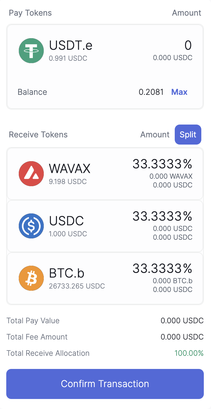 マルチスワップのベータ版では現在、11種類の暗号通貨に対応している。例えばブリッジ版USDT(USDT.e)を提供し、Wapped AVAX(WAVAX)、USDコイン(USDC)、ブリッジ版ビットコイン(BTC.b)の3銘柄に交換することが可能。交換比率についても、自由にカスタマイズできる。