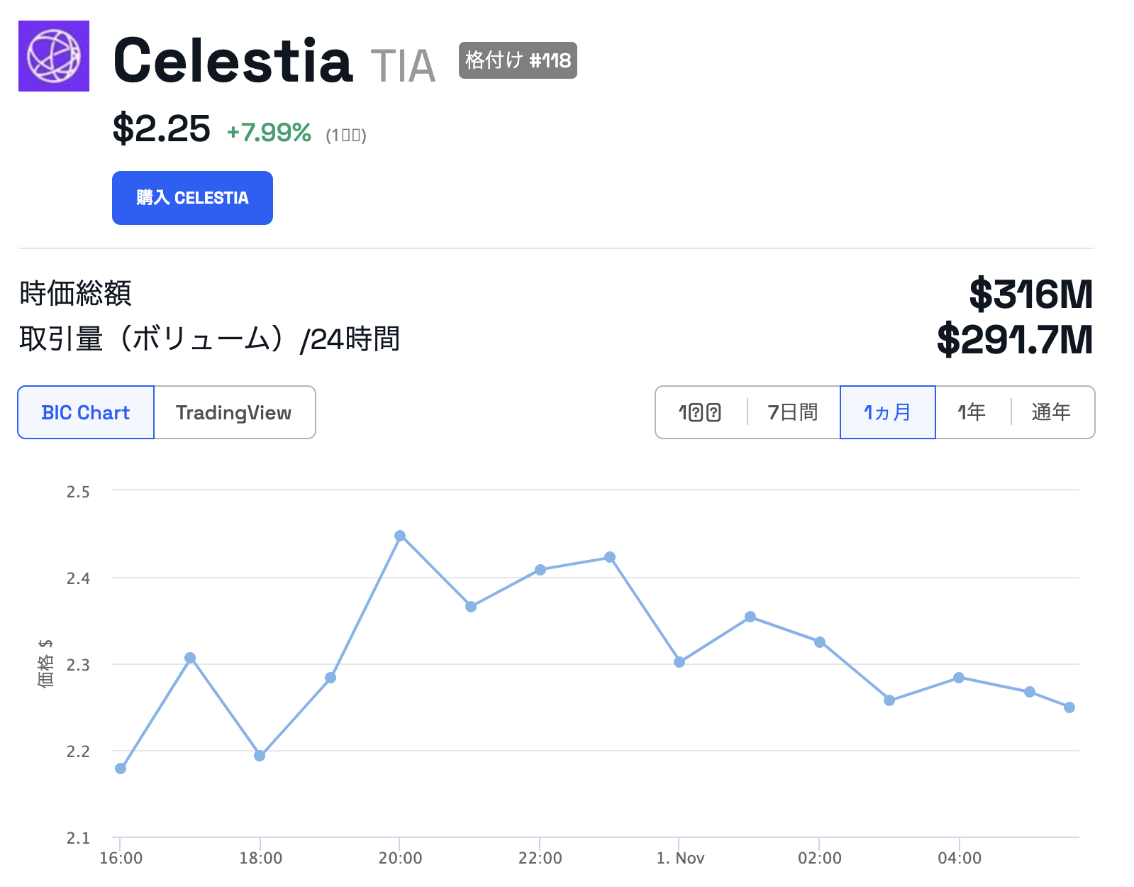 セレスティアはメインネット開始と同時に、同ネットワークのネイティブトークンTIAをローンチ。現在価格は2.25ドル、時価総額ランキング第118位。ネットワークの初期貢献者に対し、TIAトークンのエアドロップも実施されている。