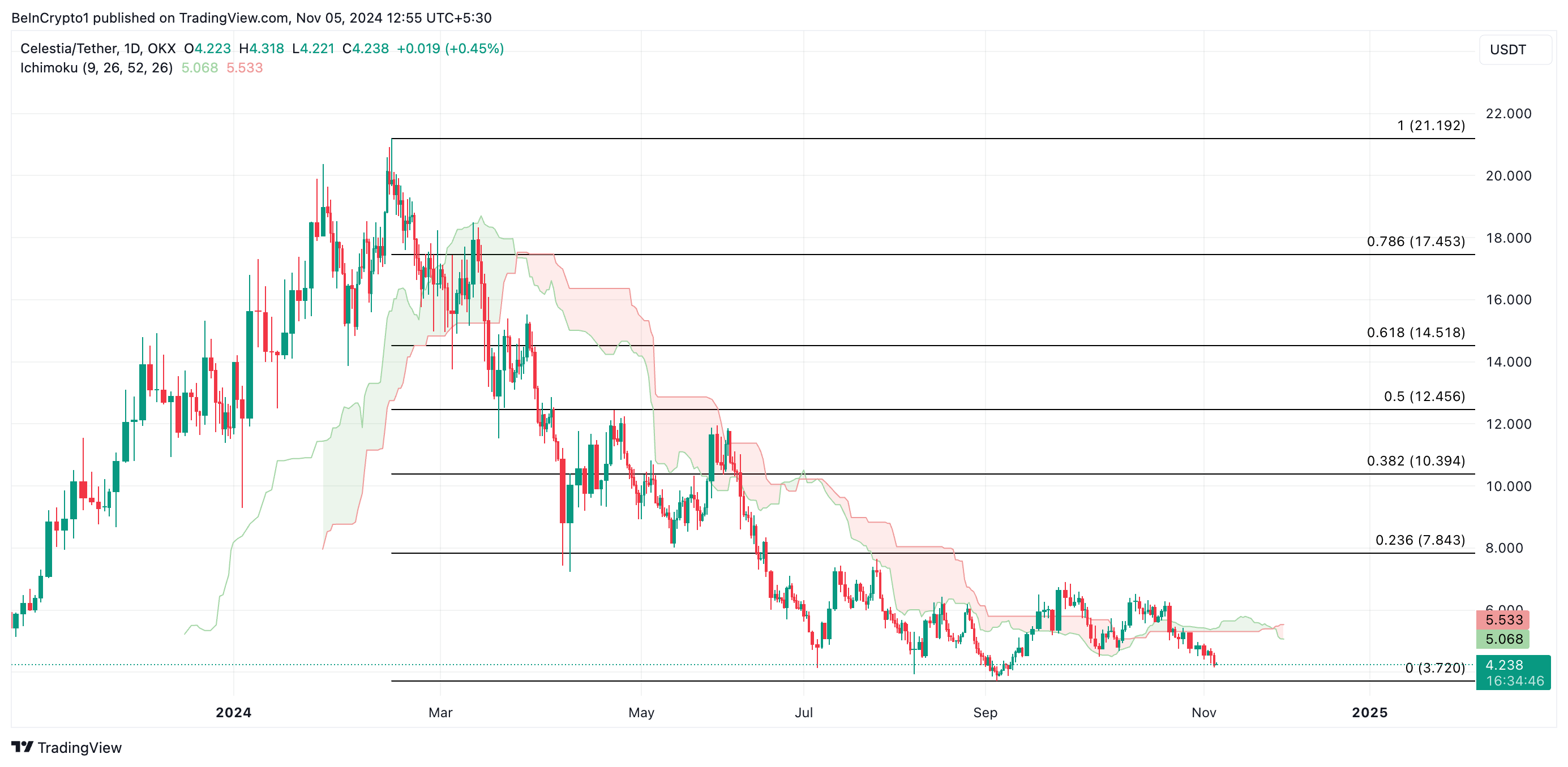 しかし、TIAに新たな需要が生じれば、価格はこの床から反発し、上昇トレンドを開始する可能性があります。この強気のシナリオでは、TIAは一目雲の抵抗レベル5ドル06セントと5ドル53セントを超えることを目指します。これらの閾値を成功裏に超えると、TIAは6月に最後に達成した7ドル84セントへの潜在的なラリーに位置づけられるかもしれません。