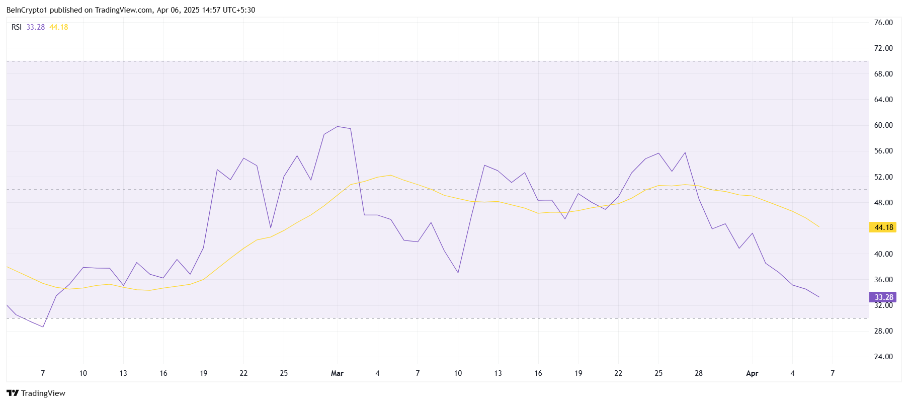 Celestiaの相対力指数(RSI)は、暗号資産が現在弱気トレンドにあることを示している。中立ラインの50.0を下回って停滞しており、RSIは売られ過ぎの閾値である30.0に近づいている。歴史的に、資産がこのレベルに達すると、売りが通常減速し、蓄積が始まるため、潜在的な反転のシグナルと見なされる。