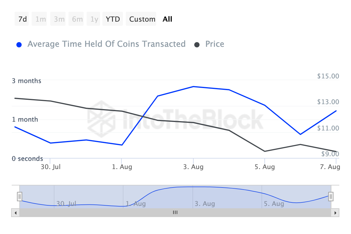 チェーンリンクのコイン保有時間を評価すると、過去7日間で293%増加していることがわかる。この指標は、投資家が暗号通貨を動かさずに保持する時間を示している。