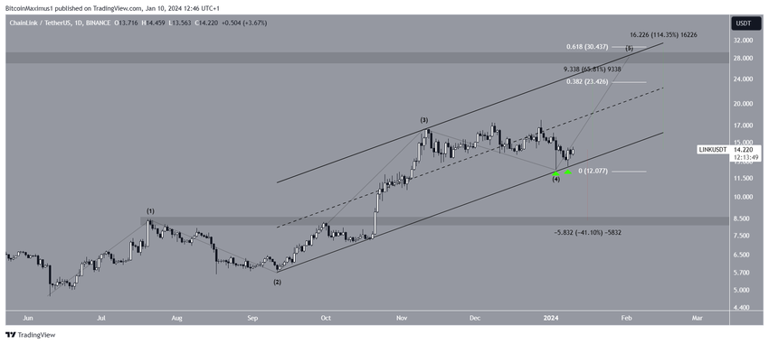 Sponsored Sponsored最も可能性の高い波動カウントは、 LINKが6月に始まった 上昇の第5波と最終波にあることを示唆している。第4波は1月3日の反発で終わり、1月8日の強気ローソク足で確認された(緑色のアイコン)。