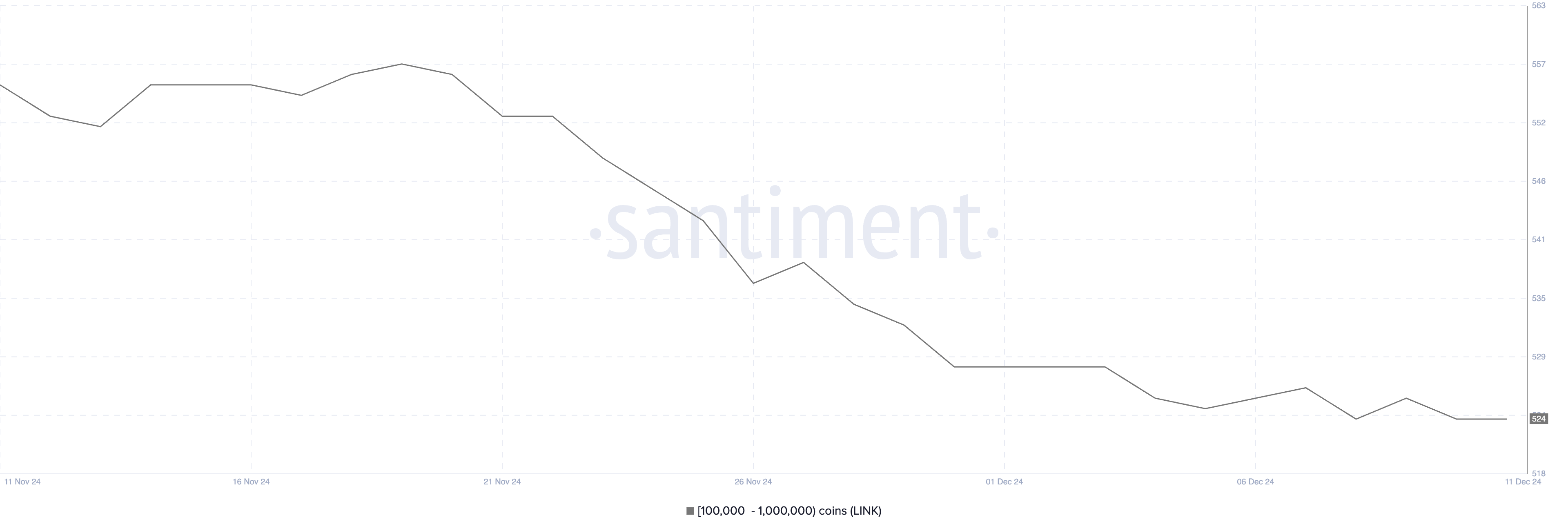 この安定は、11月19日以来、クジラの活動が一貫して減少している中でのものであり、その時点では558のウォレットがLINKを同様の量で保有していた。