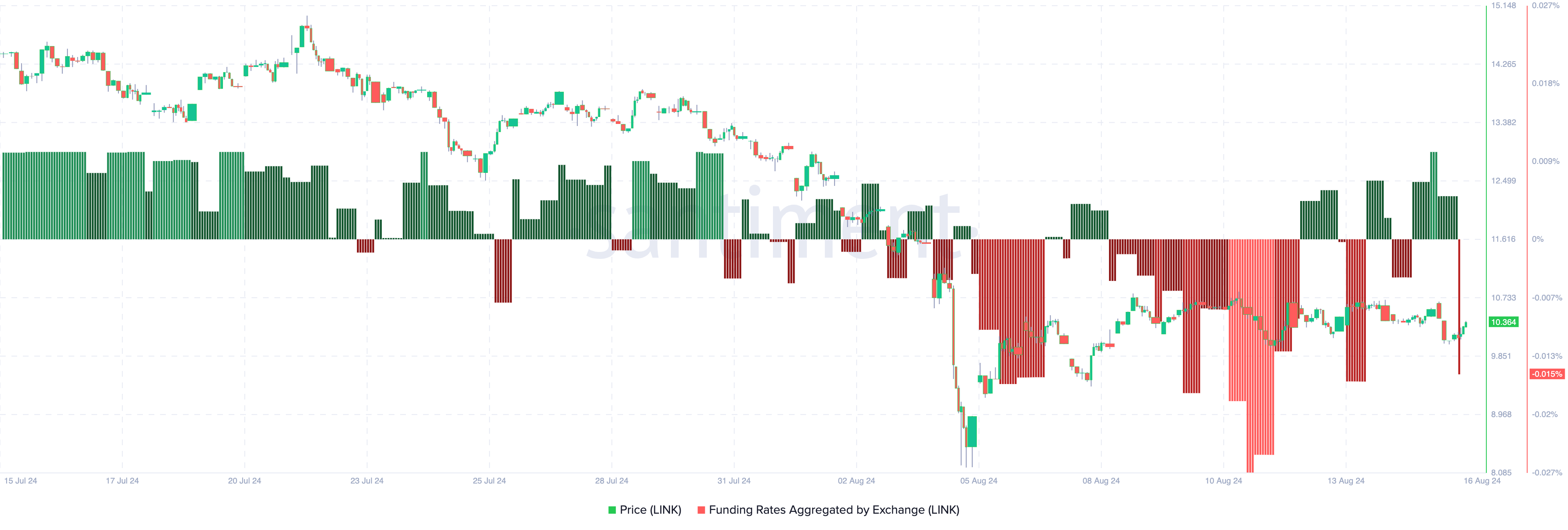 以前は、市場の平均ポジションはロングだった。しかし、最近のデータに示されるように、8月14日から15日にかけて、トレーダーは一時的にショートにシフトした。この間、LINKの価格は10.72ドルから9.93ドルに下落し、その後わずかに反発した。