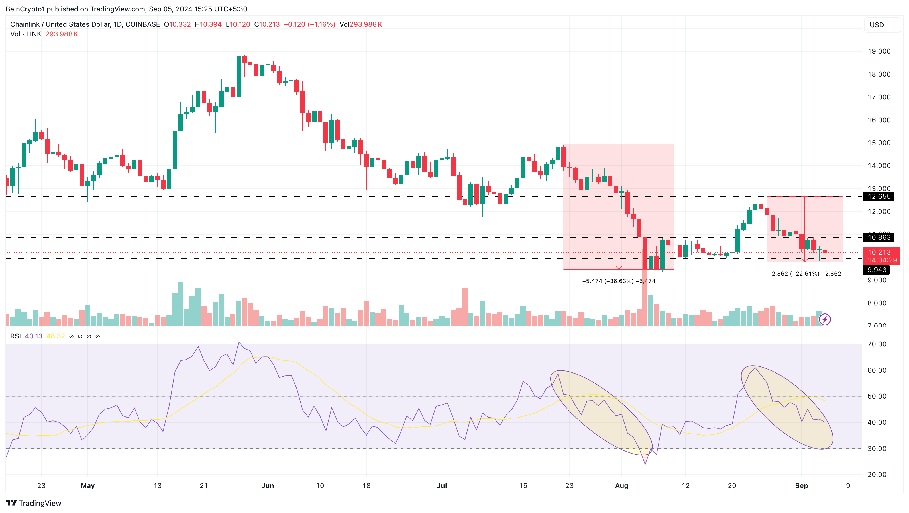 日足チャートによると、LINKの価格は相対力指数(RSI)に収束し続けています。プレス時点では、モメンタムを測定するRSIは40.22に低下しており、暗号通貨の平均利益が平均損失よりも小さいことを示唆しています。