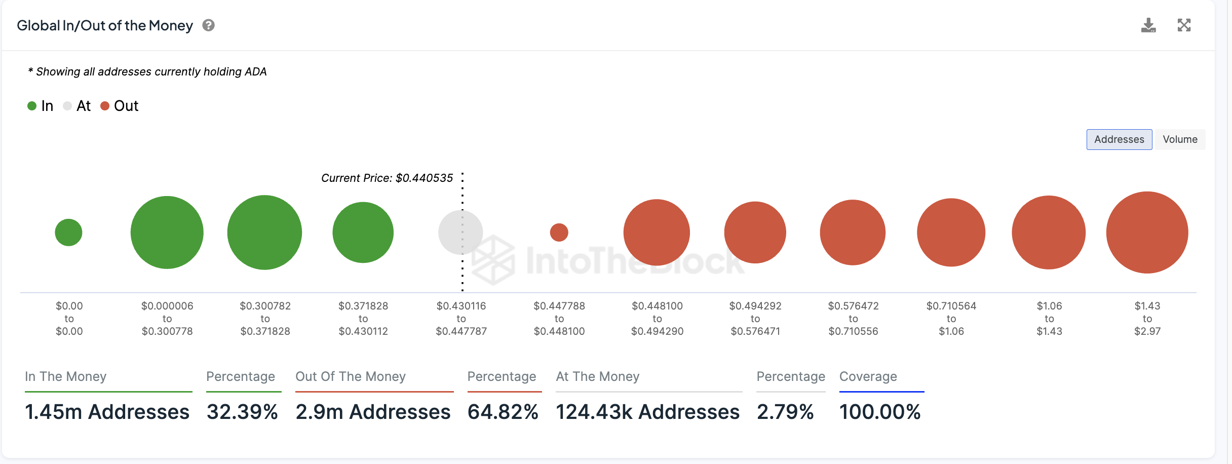 2024年の暗号通貨市場は全般的に強気であるにもかかわらず、この安定性は注目に値する。カルダノは年初来で30%近く価値が下落している。IntoTheBlockのデータによると、現在この価格で利益を上げているのはカルダノ保有者の32.39%に過ぎない。