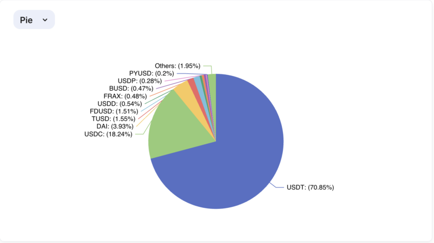 CircleのUSDCはTetherのUSDTに次いで2番目に大きなステーブルコインである。以下のスクリーンショットは、総ステーブルコイン時価総額のうち、USDCが18.24%の支配力を持っていることを示している。