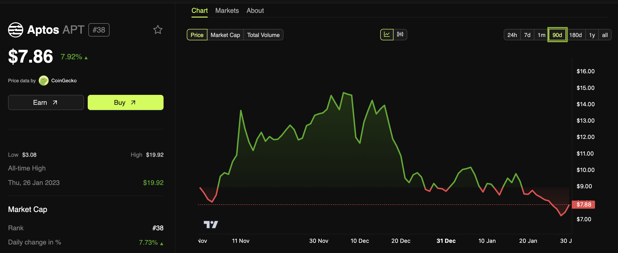 しかし、今日のサークルとのパートナーシップは価格チャートに影響を与えたようだ。APTは今日約10%上昇している。