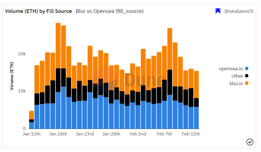 Dune Analyticsのダッシュボードによると、2月の13日間のうち12日間、Blur.ioのマーケットプレイスがオープンシーに打ち勝った。売上高のピークは2月9日の約1,700万ドルで、オープンシーの1,400万ドルを上回っている。