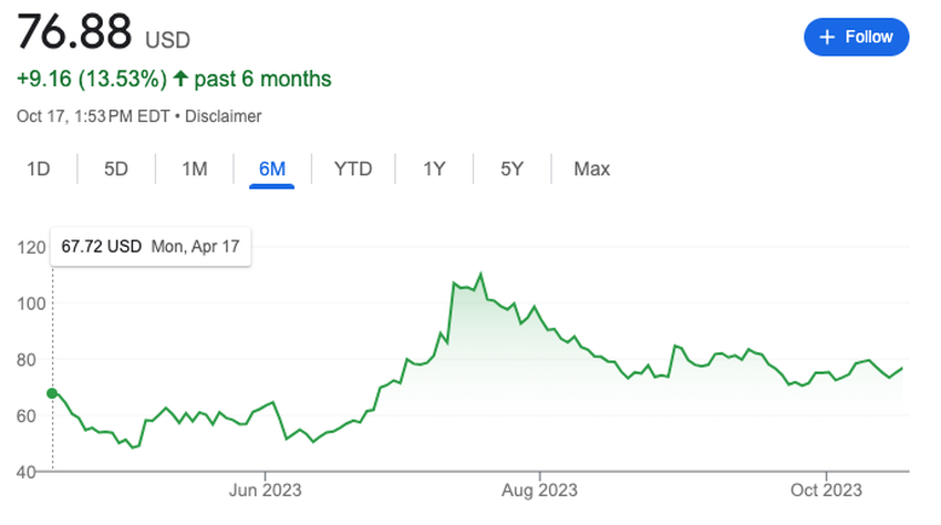 コインベース株価は17日(現地時間)、前日比3.3%上昇した77.78ドルを記録した。過去1カ月間に株価は4.7%下落したが、過去1年間に131.4%上昇した数値だ。