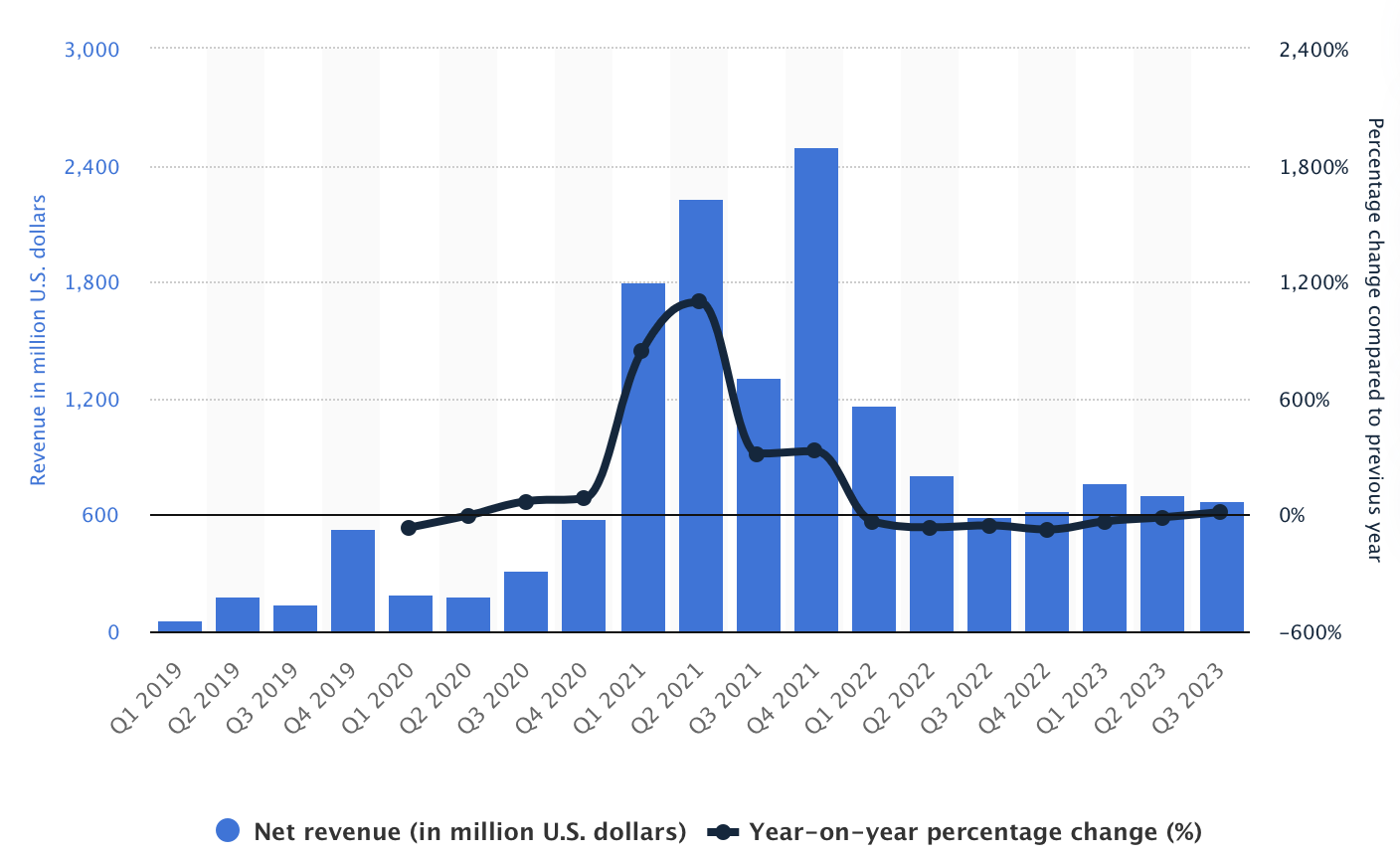 コインベースは過去2年間、安定した収益レベルを維持し、ビットコインが68,789ドルの史上最高値を記録した2021年に大幅な急上昇を経験した。