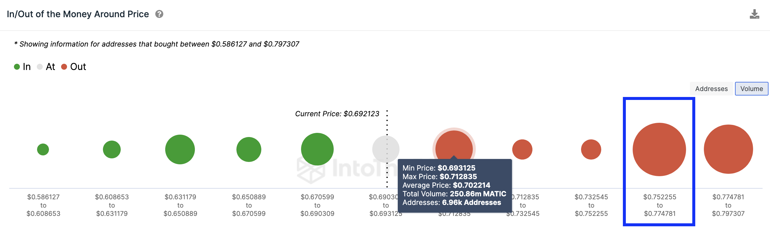 オンチェーンデータ分析サイトIntoTheBlockのIOMAPモデルによると、8日時点で2億5600万MATICを保有する6760のウォレットアドレス群(平均取得価格0.68ドル)が上値抵抗線として機能すると思われたが、同日に反発を開始。現在価格は0.68ドルをブレイクアウトし、前日比2.9%増の0.6919ドル。