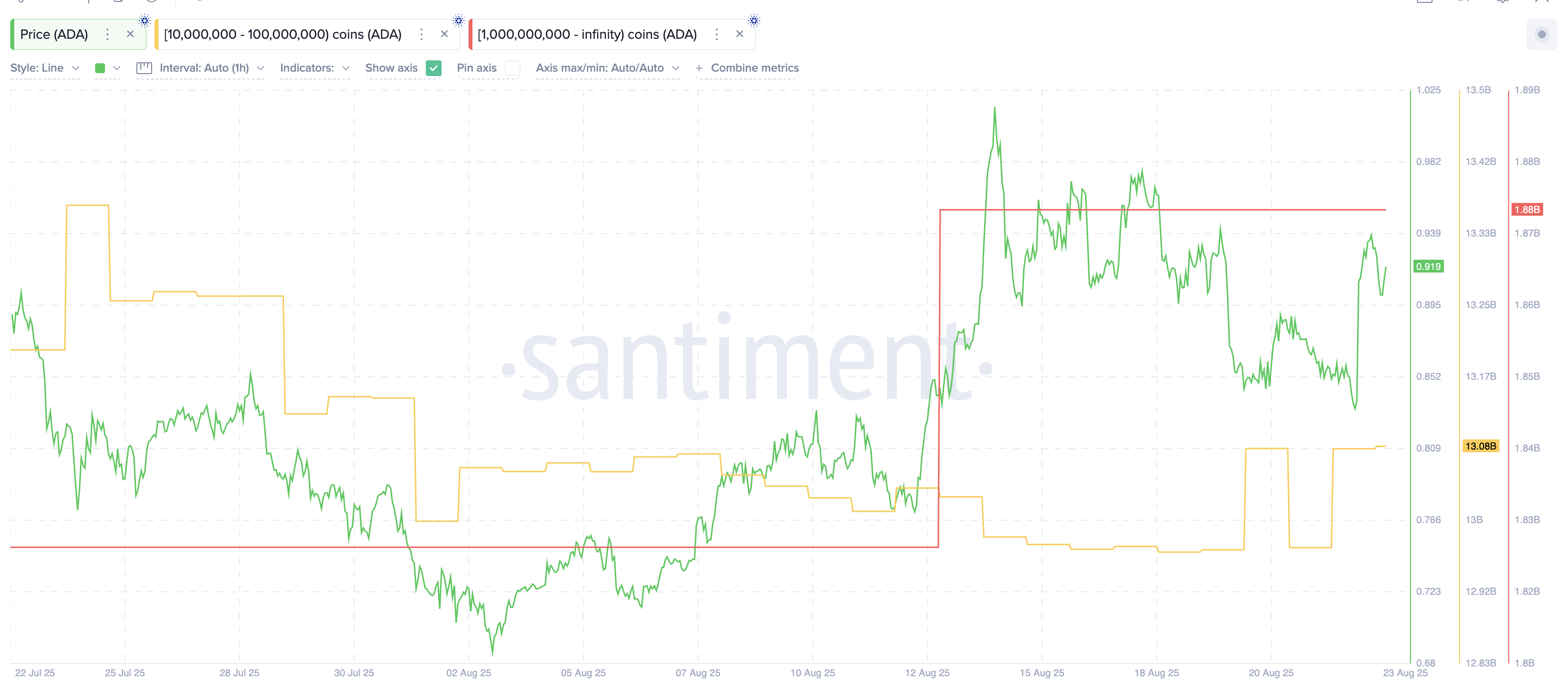 Sponsoredオンチェーンデータはクジラの関心の再燃を示している。1000万から1億ADAを保有するウォレットは、24時間で12.97億から13.08億ADAにバランスを増やした。これは110万ADAの追加で、現在の価格0.93ドルで約1億200万ドルに相当する。