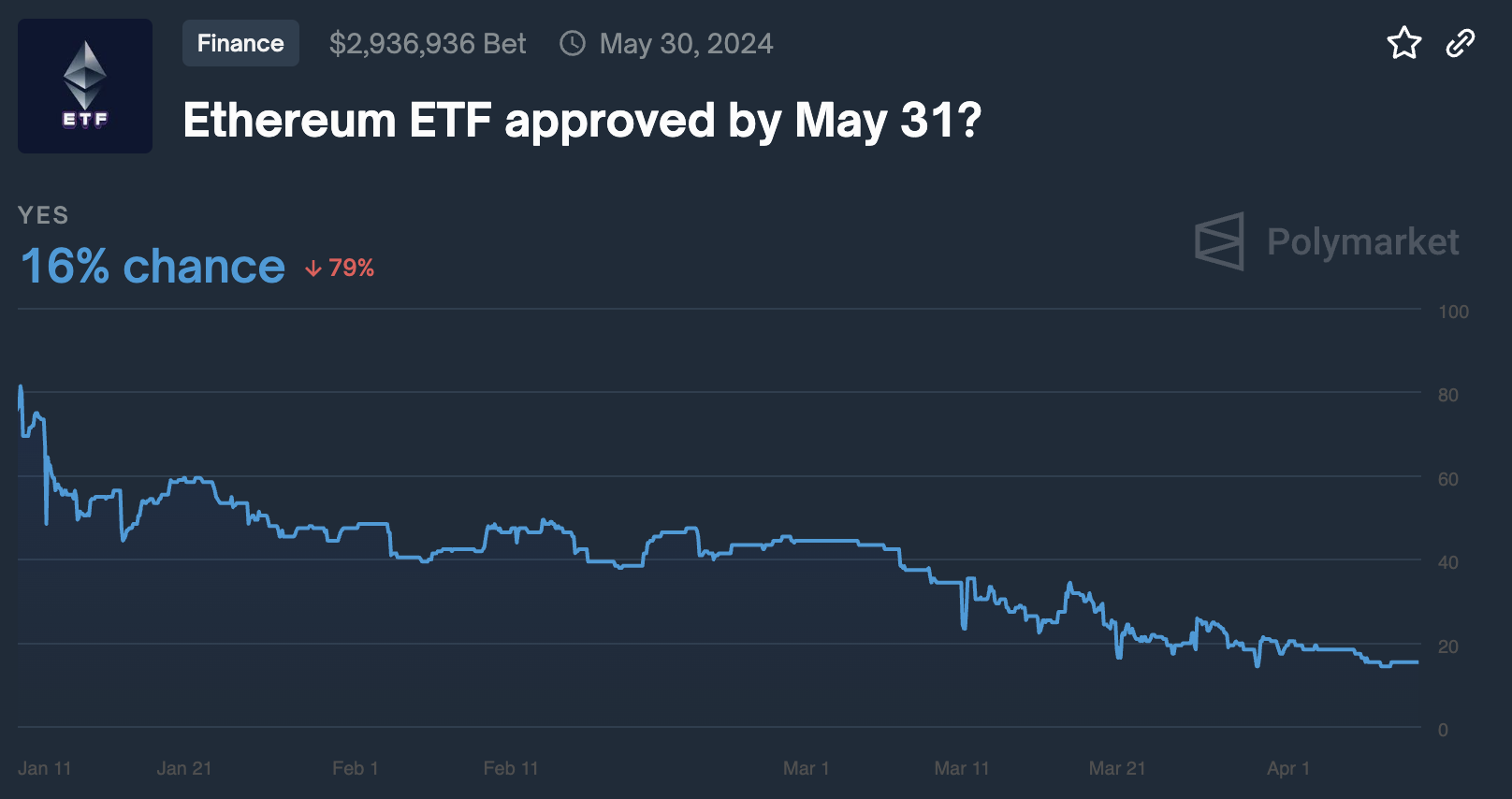 にもかかわらず、ETFアナリストのエリック・バルチュナス氏は、SECがETF申請に対するフィードバックを提供することに消極的であることを挙げ、懐疑的な見方を示した。この警戒感はより広範な市場センチメントを反映しており、Polymarketが試算したところ、5月の期限までにビットコインETFがスポット承認される可能性はわずか16%だった。