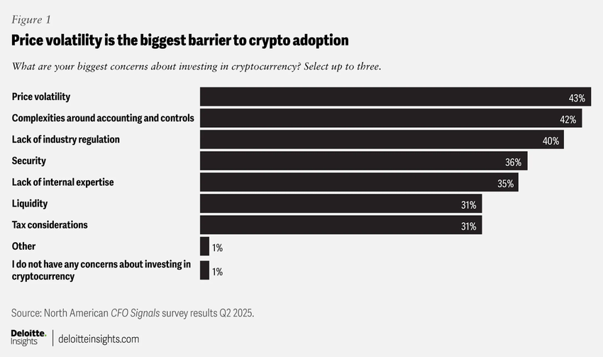 暗号資産に対する懸念は依然として大きい。約43%のCFOが価格変動性を最大の懸念事項として挙げた。この不安は、今年初めにビットコインの価値がわずか10週間で28%下落したような歴史的な不安定性を反映している。