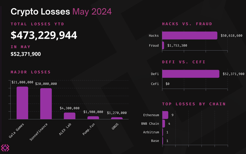 データをさらに細分化すると、2024年5月は21の異なるインシデントによって5,237万ドルが失われた。これは2023年5月の5,934万ドルから12%減少し、2024年4月の7,260万ドルから28%減少した。
