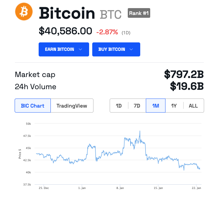現在のビットコイン価格の1%以内のビットコイン取引活動量として市場の深さを測定するFalconXは、当時の流動性は年間最低であったと述べた。スポットETFの承認以来、価格は48,494ドルから40,612ドルまで下落した。2024年1月11日と1月15日の間に約12%下落した当初を除けば、この1週間、価格は5%の範囲内で取引されている。