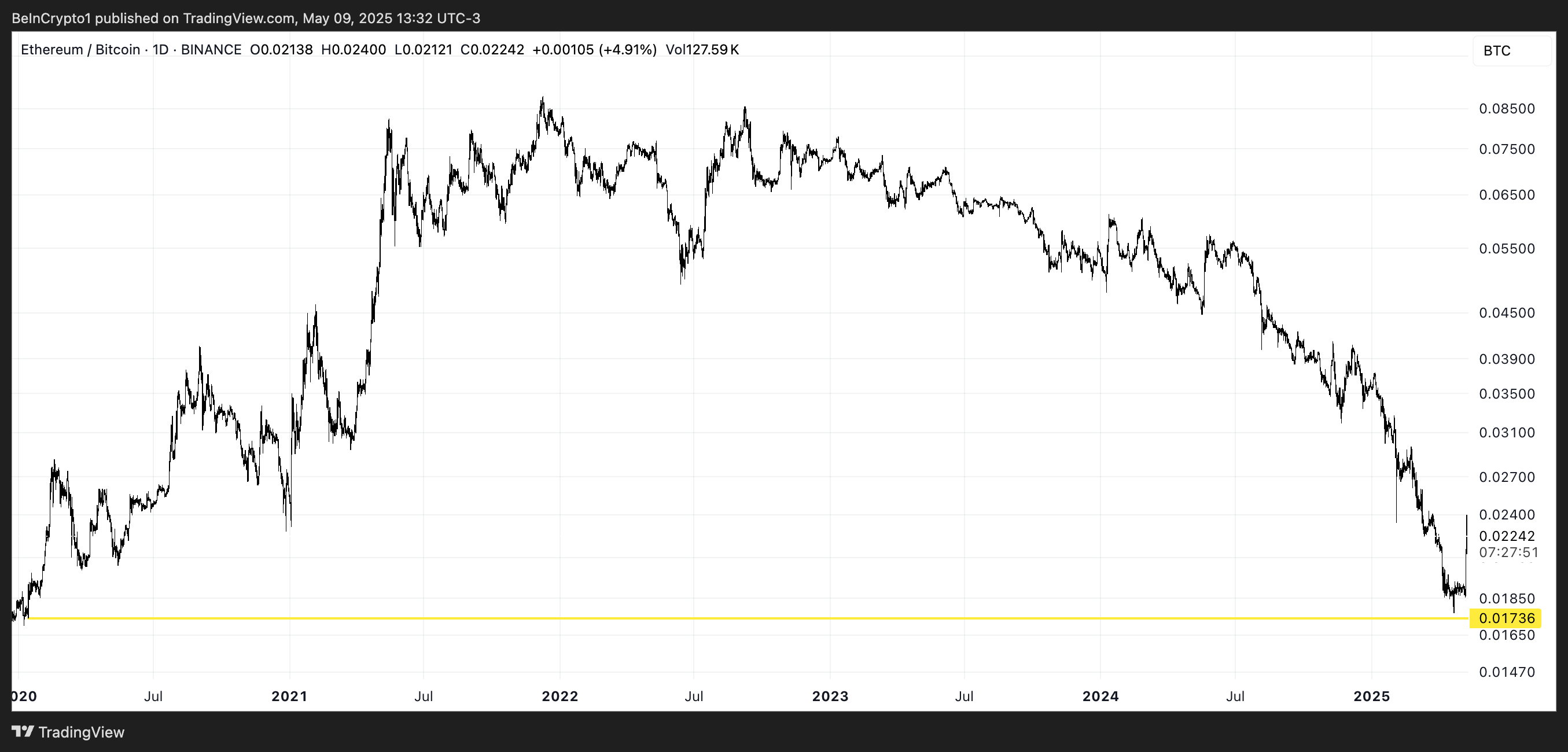 Sponsored Sponsoredこの物語に加わるのがETH/BTC比率である。これは最近2020年以来の最低水準に達し、ビットコインに対するイーサリアムの長期的な劣後を示している。