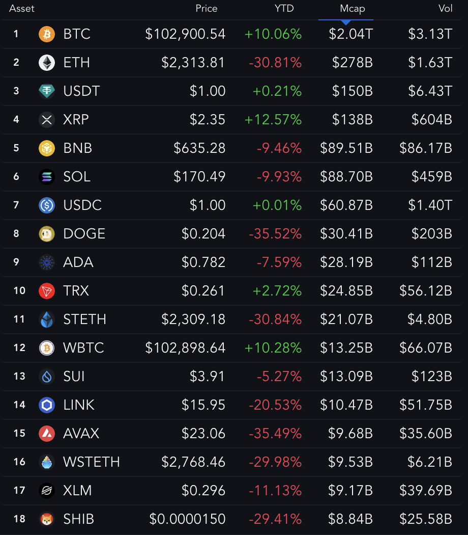 2025年これまでのところ、ビットコインは年初来で10%上昇している。主要なアルトコインのほとんどを上回っているが、XRPだけは12%以上の上昇を見せた。一方、イーサリアムは年初来で30%下落しており、LINK、DOGE、AVAX、SHIBといったコインも20%以上下落している。