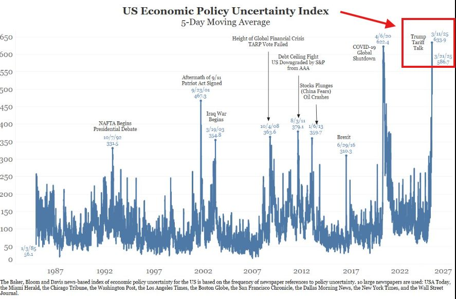 この中で、あるアナリストは、米国経済政策不確実性指数が前例のない高水準に達したと指摘した。この指数は、政策変更に関連する米国経済の不確実性のレベルを測定するものである。