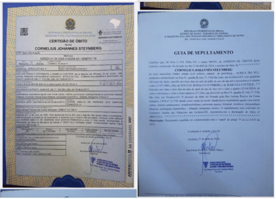 2021年12月からピレノポリスの農場に軟禁されていたスタインバーグ被告は、南アフリカへの身柄引き渡しを待っていたところ、同被告が深刻な健康危機に見舞われた。同容疑者の弁護士であるタレス・ジェイム氏が確認したところによると、同容疑者の死に至るまでの数週間、精神面での問題が悪化していたことが報告されている。