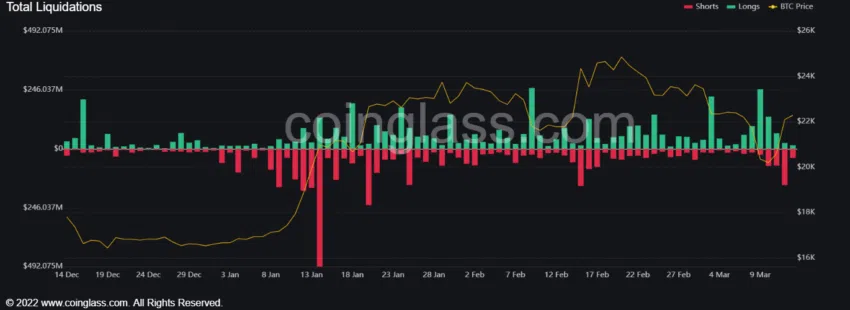 (内容は)約 418 BTC が 920 万ドルで清算され、751 万ドル相当のイーサリアムが清算された。これによってビットコインの価格は9%以上上昇し、22,000ドル以上に戻った。