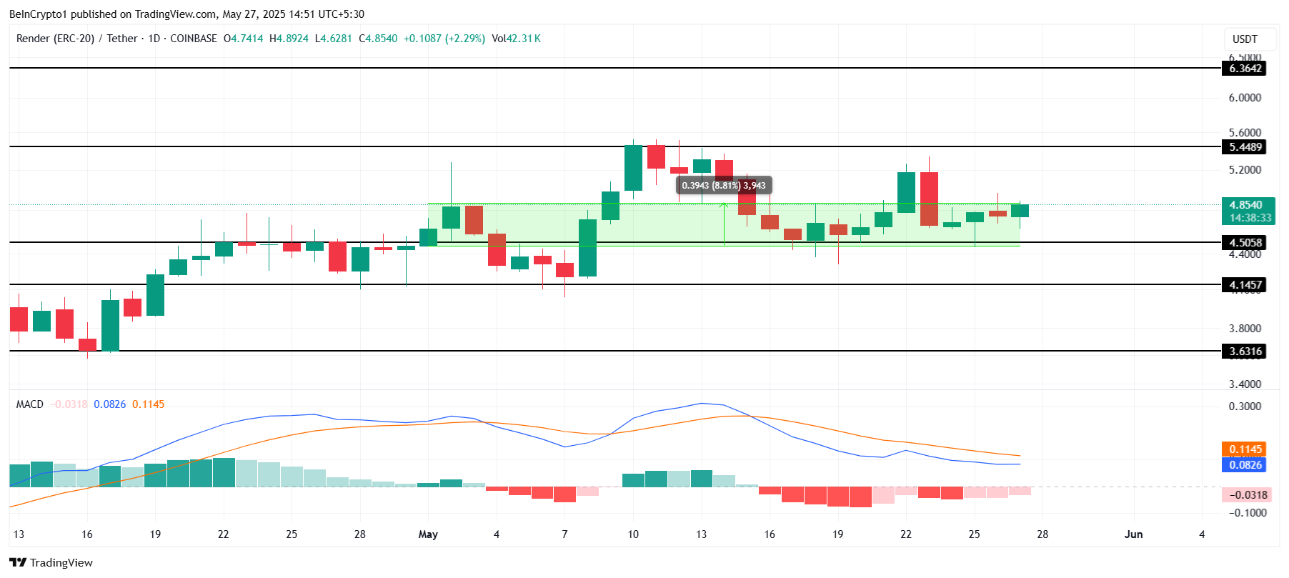 MACD指標は、RNDRが上昇クロスオーバーに近づいていることを示唆しており、さらなる上昇の可能性を示している。決算報告がこの勢いを支えれば、AI暗号資産トークンは5.44ドルに向けて上昇する可能性がある。この抵抗を突破すれば、6.36ドルへの道が開け、大幅な上昇を示す。