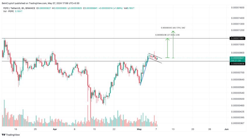 このようなパターンは、上昇モメンタムの継続を示唆することが多い。Pepeがこの形成からうまく抜け出せば、価格は40%上昇し、0.00001186ドルに達する可能性がある。控えめに見ても、0.00001081ドルの前回史上最高値に向けて28%まで急騰する可能性がある。