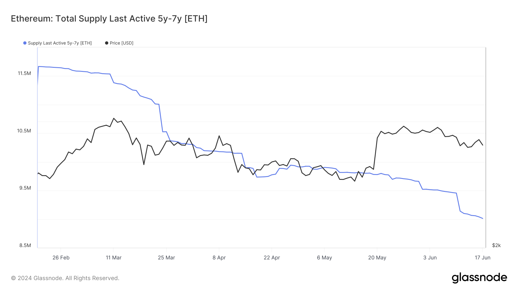 さらに、イーサリアム保有者のより広範な傾向は、同様の減少パターンを示している。オンチェーン分析プラットフォームGlassnodeのデータは、5~7年間動かなかったETHの総供給量の顕著な減少を明らかにしている。この指標は22%以上減少しており、2月下旬の1160万ETHトークンから現在の901万ETHまで減少している。