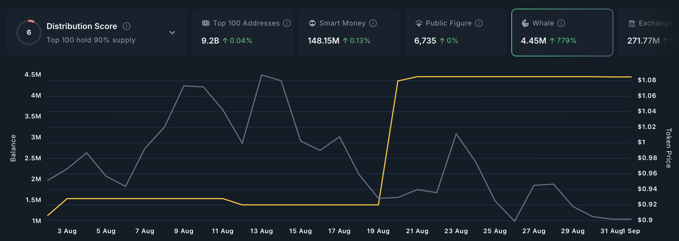 サム・アルトマン関連のWLDは、今月クジラが利益を狙って蓄積している資産の一つ。Nansenによれば、WLDを100万ドル以上保有するクジラウォレットは、過去1か月でトークン供給を779%増加させた。