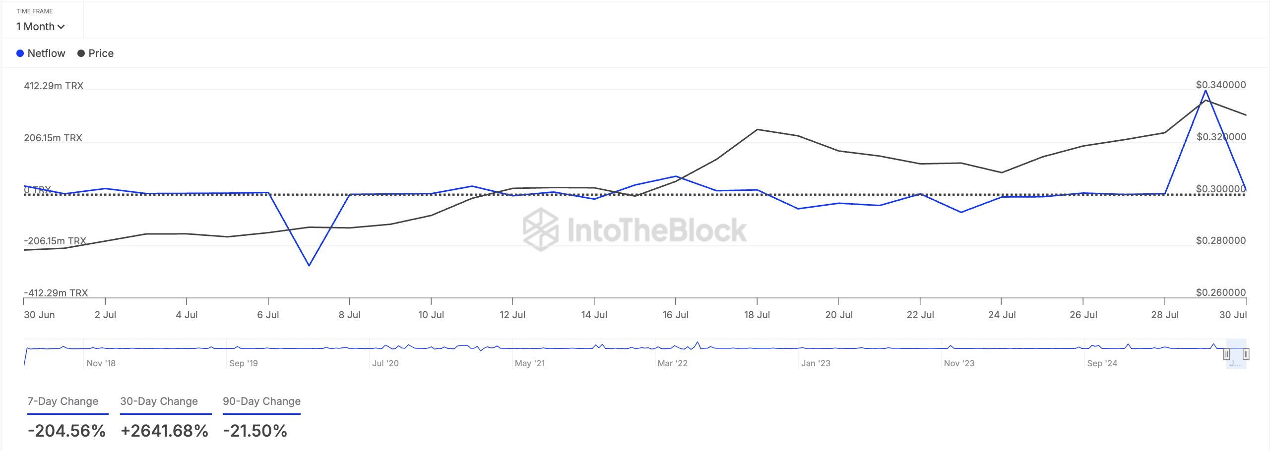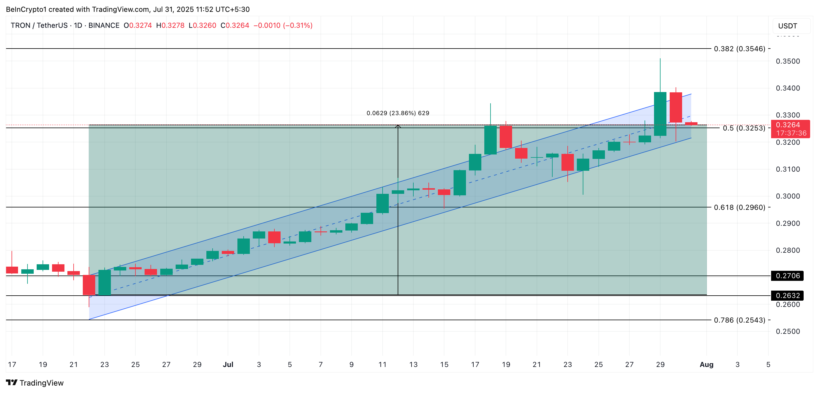 トロン(TRX)は6月22日以降、上昇トレンドラインに沿って推移しており、価格はすでに24%上昇している。7月29日にはクジラの蓄積行動に支えられ、約半年ぶりとなる0.35ドルの高値を記録した。