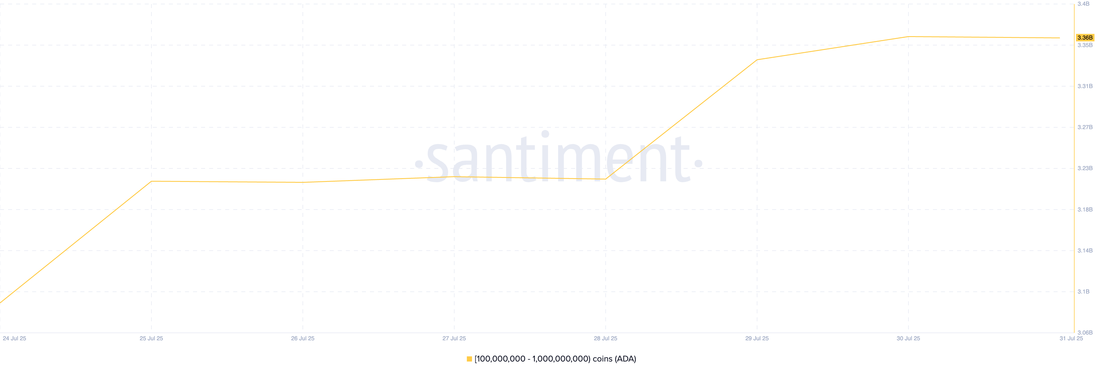レイヤー1(L1)トークンであるカルダノ(ADA)は、8月の値上がりを見込むクジラの主要な投資対象として浮上している。オンチェーンデータによれば、7月24日以降、100万〜10億ADAを保有する大口投資家が270万ADAを追加で取得した。この量は現在の市場価格で約2億1000万ドル(約300億円)以上に相当する。
