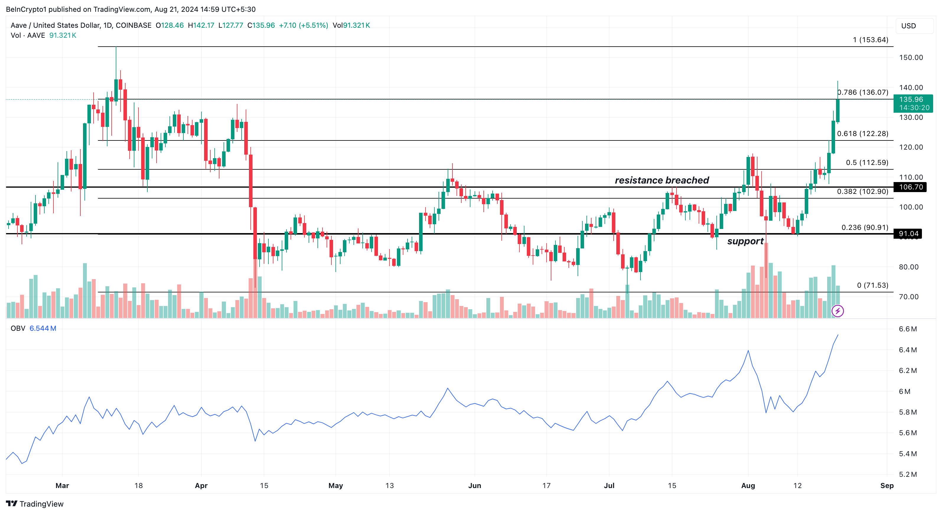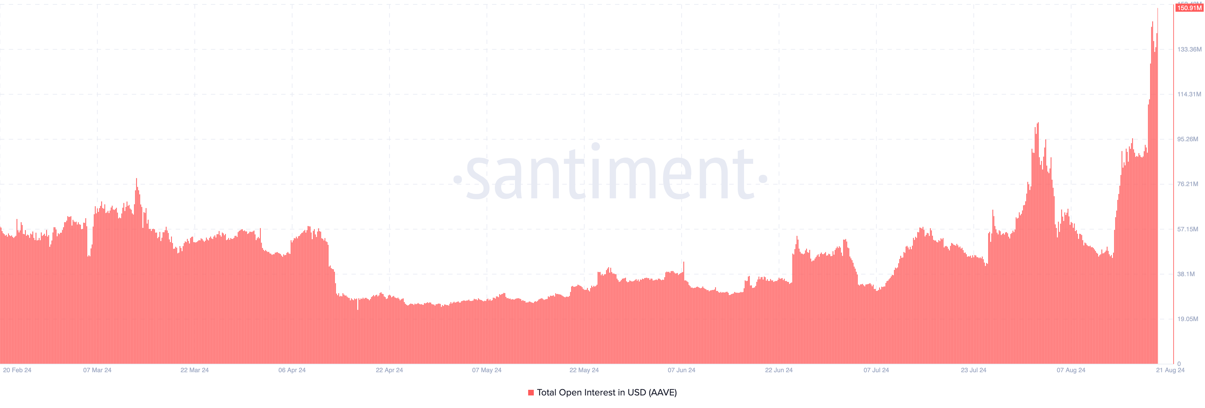 さらに、Aaveのオープンインタレスト(OI)は8月13日以降急増している。その日のOIは4500万ドル以下だった。現時点では1億5,394万ドルに急増し、2023年8月以来の高水準を記録している。
